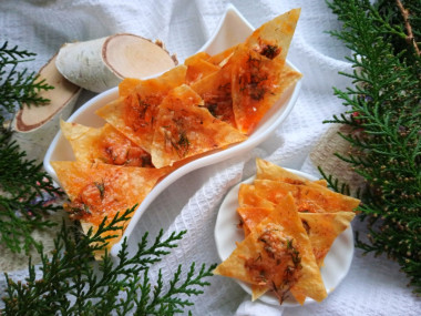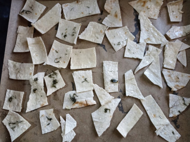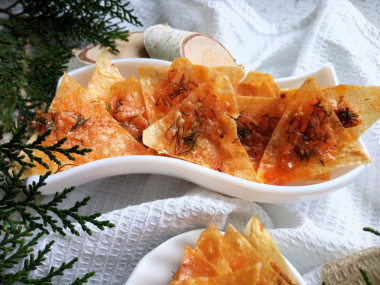 Сын попросил сделать чипсы из лаваша, хотел похрустеть за просмотром фильма со своей подругой) А мне не сложно, тем более чипсы из лаваш готовятся ну очень быстро. Кстати разрезанный на фрагменты лаваш надо смазывать быстро, а то он начинает подсыхать. В масло я добавила копченую паприку для цвета и пикантности и немного черного перца. Сыр и укроп разложила на каждый кусочек понемногу. Как и указано в рецепте, запекала пять минут. Чипсы были уже совершенно готовы! Они получились хрустящими, вкусными, немного островатыми и очень ароматными! Отличная замена готовым магазинным чипсам. Ребятам понравилось, я тоже отсыпала себе на пробу) Спасибо за рецепт!