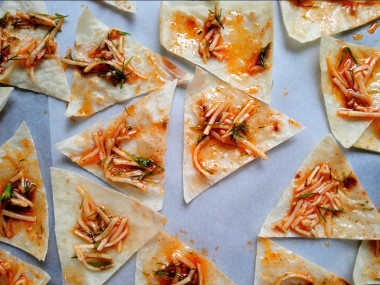 Противень застелите пергаментной бумагой (бумагой для выпечки) и разложите на нём подготовленные куски лаваша.