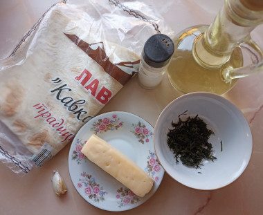Калорийность продуктов: Лаваш тонкий, Оливковое масло, Укроп, Чеснок, Твёрдый сыр, Соль, Перец черный молотый