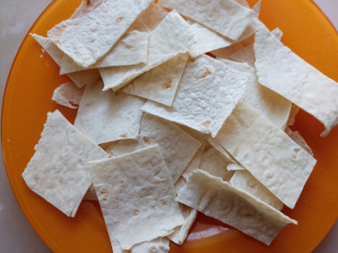 Нарежьте ножницами лаваш на треугольники или квадраты, как Вам нравится больше. Причем куски не обязательно делать одинакового размера. Можно это увлекательное занятие поручить детям.