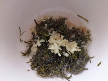 Помойте и мелко нарежьте зелень укропа, очистите пару зубчиков чеснока и пропустите его через пресс и натрите сыр на мелкой терке.