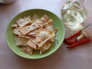Вместе с внуком приготовили домашние чипсы из лаваша в духовке. Укроп у меня был соленый, поэтому соль дополнительно не добавляла, вместо оливкового масла использовала подсолнечное, рафинированное, измельчила чеснок, перемешала эти компоненты и с помощью кулинарной кисточки смазала нарезанные кусочки лаваша. Сверху на лаваш выложила натёртый твердый сыр. Запекала в духовке до лёгкого зарумянивания. Чипсы получились отличные! Тонкие, хрустящие, рассыпчатые, ароматные! И готовятся они быстро и просто. Прекрасно подойдут для лёгкого перекуса , порадуют и любителей пива))) С удовольствием будем готовить их ещё. Спасибо автору за рецепт!