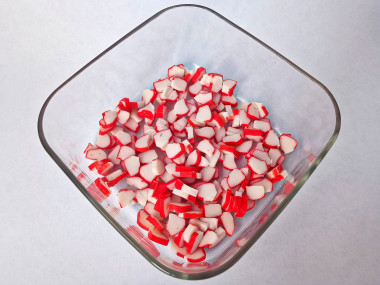 Крабовые палочки нарежьте тонкими кружочками или маленькими кубиками, как вам больше нравится.