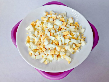 Остывшие яйца очистите от скорлупы и нарежьте произвольно некрупно. Я нарезала небольшими кубиками.