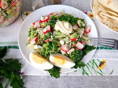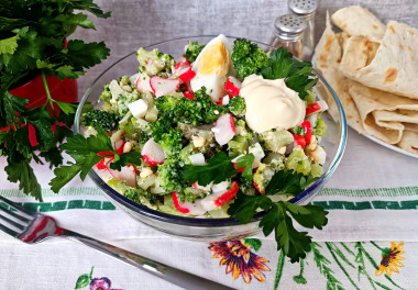 Я никогда раньше не использовала брокколи в салатах и, честно говоря, когда увидела рецепт салата брокколи крабовые палочки яйцо и майонез, очень сомневалась: «Как может быть вкусным салат из брокколи? Ведь он же весь помнётся, превратится в кашу!» Но решила попробовать — в морозилке как раз лежала замороженная брокколи. Меня подкупило ещё то, что рецепт очень простой и быстрый, а это именно то, что нужно, когда времени на готовку — минимум.