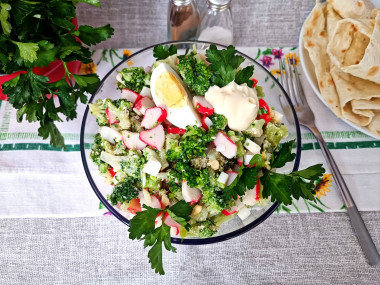 Замороженную брокколи заливаю кипятком из чайника, и даю настояться десять минут. Так брокколи остаётся хрустящей. Для сочности в салат можно добавить маринованных огурчиков, но салат и без них хорош. Спасибо за рецепт !