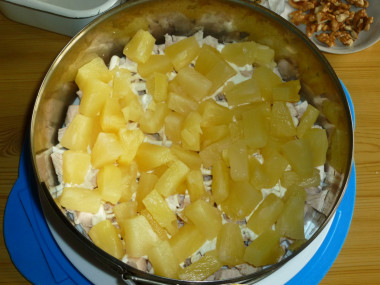 Следующим слоем выложите консервированные ананасы и также полейте их майонезом.