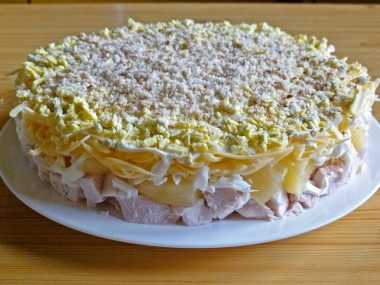 Салат грибы ананас сыр - вкусный и эффектный слоеный салат для праздничного стола. Вкус у этого салата очень нежный, в нем нет острых специй, все ингредиенты отлично сочетаются.Мне очень нравятся салаты именно с маринованным обжаренным мясом, а не вареным. Такое мясо придает салату особенный вкус. Свой салат я украсила грецкими орешками. Большое спасибо за рецепт!