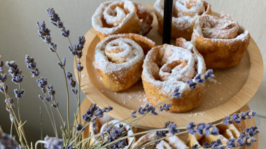 Час времени, и вот такие аппетитные розочки получились. Готовое блюдо можно посыпать сахарной пудрой или полить медом, кто как любит. Обязательно попробуйте приготовить! Спасибо автору за рецепт!!!