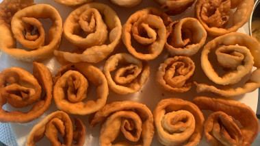Выкладываем приготовленное печенье «хворост» на застеленную кухонной салфеткой тарелку.