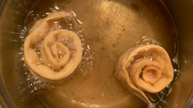 Придерживайте заготовку второй вилкой и немного ее раскручивая обжаривайте во фритюре по одной-две минуты с каждой стороны.