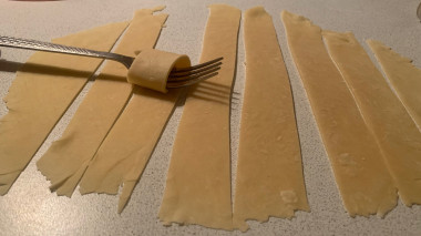 Возьмите две вилки, затем свободно накручивайте на одну вилку заготовку из теста, после чего при помощи второй вилки опускайте заготовку в сотейник с разогретым маслом.