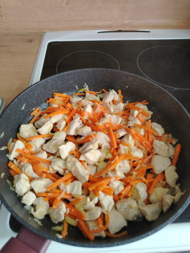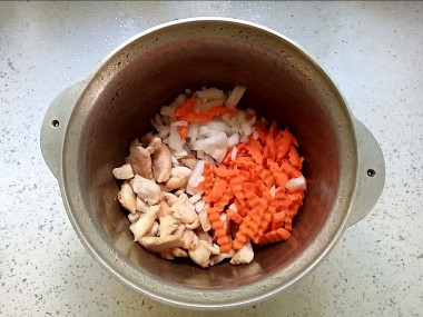После 5-10 минут обжаривания добавьте к курице морковку, лук и чеснок. Обжаривайте, периодически помешивая ещё 7-10 минут.