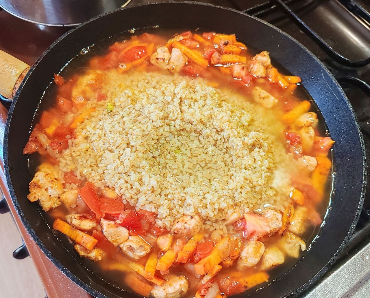 Кусочки куриной грудки я обжаривала на сильном огне, чтобы кусочки не слиплись. Затем добавила в казанок лук кубиками и морковь брусочками. В готовом виде лук почти растворился, сделав плов сочным. А морковь осталась почти целой, при этом поделившись своим вкусом и цветом. Помидоры во вторых блюдах у нас не любят, поэтому заменила на томатную пасту. Она тоже дала плову приятную кислинку и дополнительную сочность.