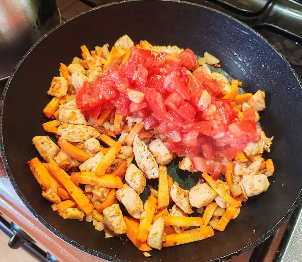 Добавьте к мясу помидоры. Посолите всё по вкусу, поперчите и оставьте ещё на 5 минут. На данном этапе можно использовать любимые специи или готовую смесь приправ для плова.