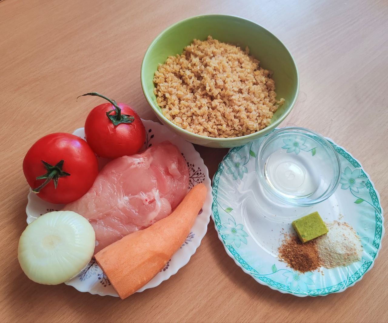Как сделать ПП плов из булгура с курицей? Подготовьте все указанные по списку продукты. Куриную грудку можно заменить на любое мясо, только при этом время приготовления чуть увеличится.