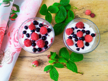 Сделала ягодный десерт из малины, ежевики и смородины. Получилось очень вкусно, сливки напомнили вкус мороженного, а смородина придала десерту неповторимый аромат лета 🙂