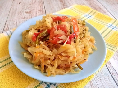 Все посолите, поперчите и перемешайте, обминая руками, чтобы капуста дала сок. Можете добавить свои специи по вкусу, например специальную смесь специй для тушеной капусты.