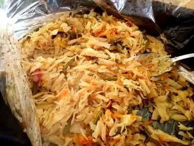 Долго сомневалась что можно приготовить капусту в рукаве в духовке. Но решила попробовать. Капусты у меня было около килограмма, нарезала её соломкой. Добавила лук и морковку натертую. Болгарский перец у меня был замороженный. От себя добавила чесночные стрелки, заготовленные с лета. Все смешала в большой миске, посыпала солью и перетерла. Заодно посыпала эту хрустящую смесь сушеной петрушкой. Поместила овощи в рукав, добавила масло и завязала концы. Запекала капусту в течение часа, через каждые 20 минут встряхивала пакет, чтобы перемешать содержимое. Удивительно, но капуста получилась такой вкусной! И очень сочной, ароматной! Цвет капусты стал золотистый. Она полностью приготовилась. Этот вариант особенно понравился моему мужу, который стремится сократить жареную пищу.