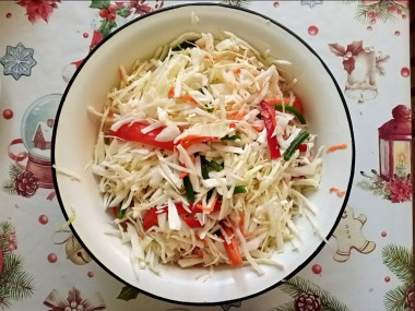 В миске соедините лук, капусту, морковь и болгарский перец.