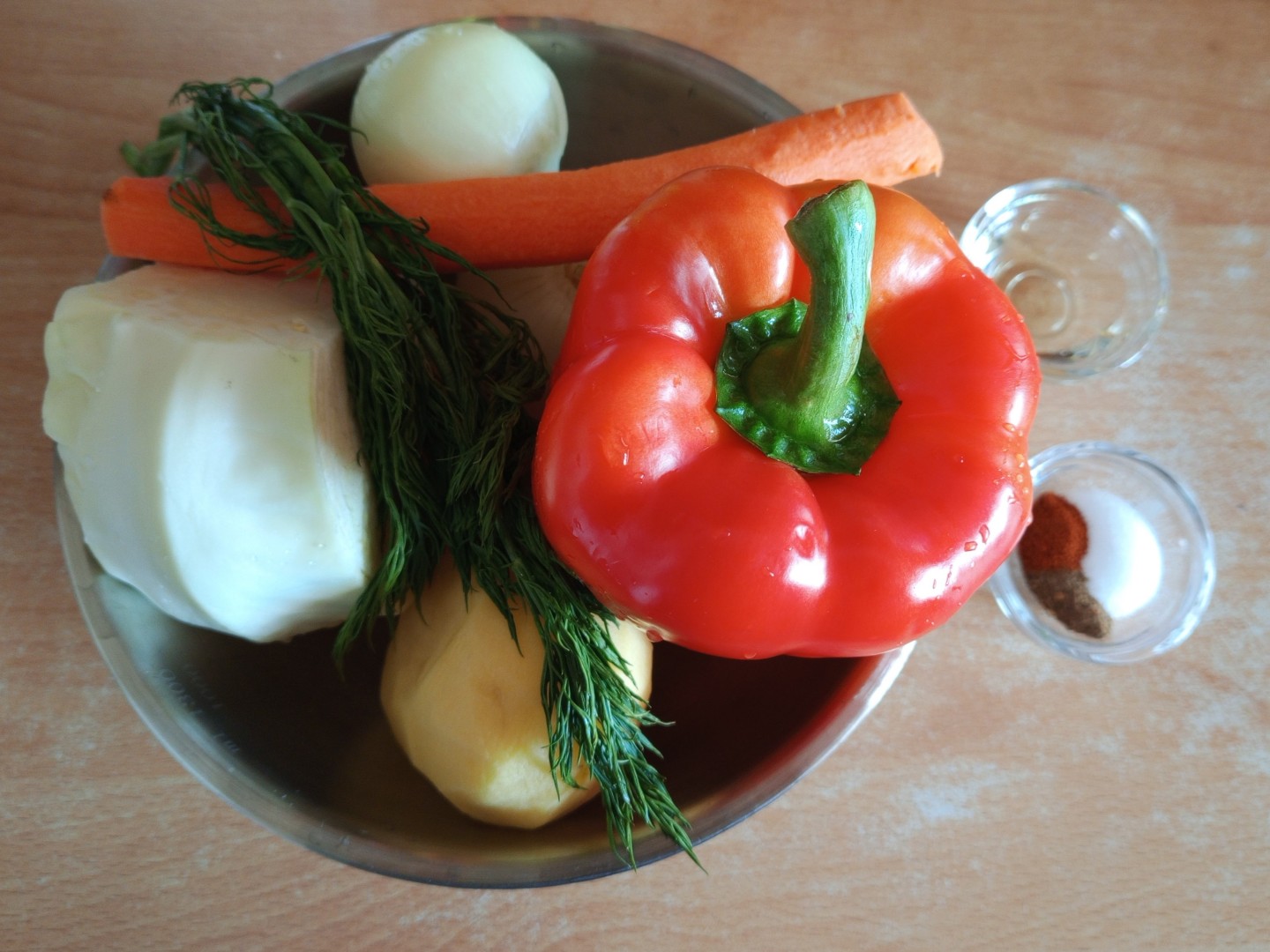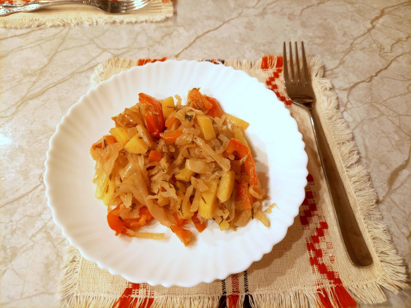 Готовила по шагам рецепта, только добавила пару картофелин. Очень удобно, что не нужно стоять у плиты, достаточно нарезать овощи и ждать готовности.