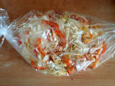 В пакет для запекания выложите подготовленные овощи. Сверху полейте растительным маслом. Пакет с двух сторон крепко завяжите, чтобы сок из него не вытекал. Переверните пакет несколько раз, чтобы все ингредиенты покрылись маслом.