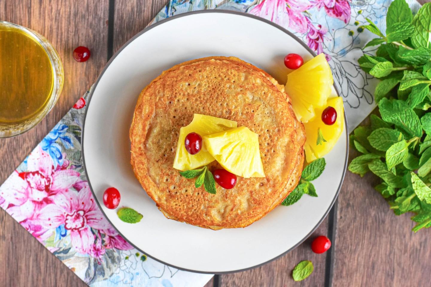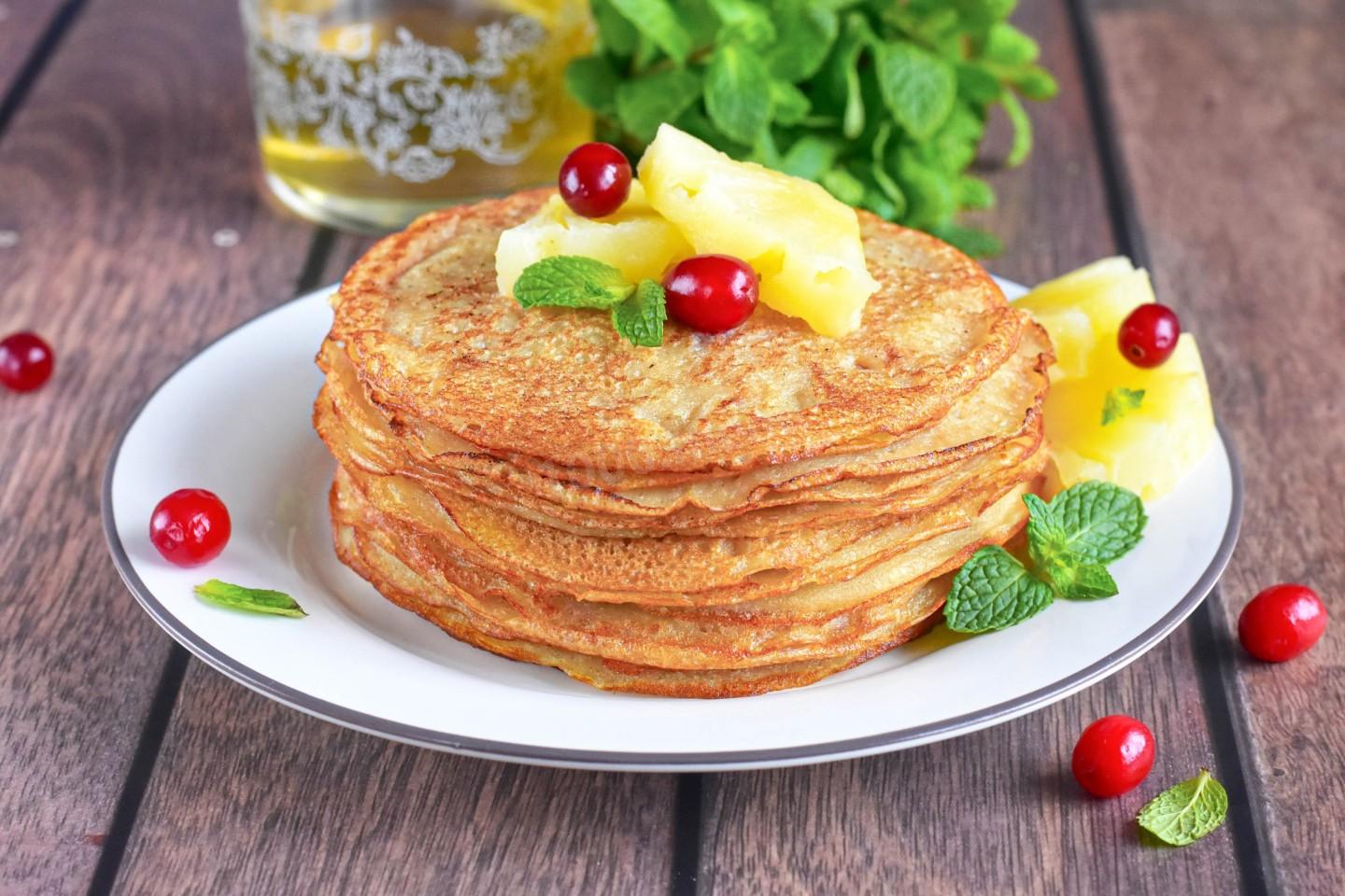 Чем заменить молоко в блинах? Подойдет любая кисломолочка (кефир, простокваша, ряженка, катык, айран и т.д.) или альтернативное растительное молоко (овсяное, соевое, миндальное и т.д.). А если хотите постный вариант — используйте обычную воду или кипяток. В этом рецепте добавляется сироп от консервированных фруктов: он дает приятную сладость и аромат.