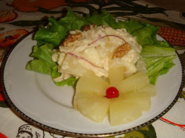 Делала и слоями и вперемешку нарезая курицу и ананасы крупно, а сыр и яйцо натирала на тёрке. Во всех вариантах салатик наш фаворит