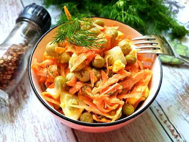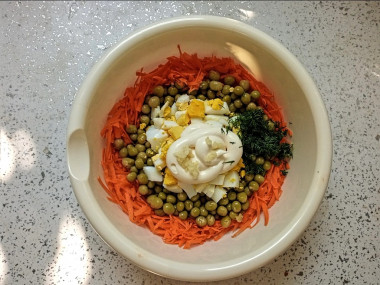 Случайно увидела на сайте рецепт салата с морковью горошком и яйцом и сразу решила сделать его на ужин. Состоит он из самых простых и доступных продуктов, а это очень удобно. Осенью самая сладкая и ароматная морковка, которая стала отличной основой салата. Я натерла её на крупной тёрке. Яйца взяла свежие, домашние. Горошек не отмеряла, добавила всю банку. Майонез использую редко, но в этот раз очень захотелось именно майонезного салатика) Количество чеснока увеличила в два раза. Кроме молотого перца и соли добавила щепотку сахара для баланса вкуса. Зелени много не использовала, веточки укропа на мой вкус вполне хватило. Салат настаивался в холодильнике два часа. За это время все ингредиенты отлично "подружились") Салат очень вкусный, пряный и достаточно сытный. По вкусу преобладает морковь. Кстати, перед подачей, я нашла в холодильнике остатки маринованных шампиньонов и решила добавить их в салат. Сочетание оказалось удачным. Думаю, в следующий раз можно попробовать дополнить этот замечательный салат колбасой или курицей. Автору большое спасибо за рецепт!