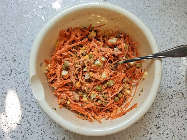 Также в качестве заправки можно использовать не только майонез, но и сметану или натуральный йогурт. Их можно взять по отдельности либо смешать с майонезом в любой пропорции на свой вкус - это снизит калорийность блюда.