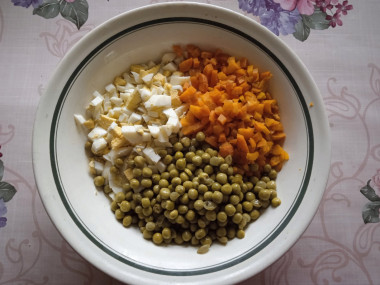 Мне очень понравился салат с морковью горошком и яйцом. Решила готовить, все продукты есть. Сразу увеличила количество ингредиентов. Консервированный зелёный горошек взяла для салата домашнего приготовления. Отварила домашние яйца вкрутую. Вместо сырой моркови захотелось добавить в салат варёную морковку. Поэтому я отварила морковь до полной готовности. Взяла карликовую морковь, она более сладкая и сочная. Остывшие яйца и морковь почистила и нарезала небольшими кубиками. Пропустила через пресс головку чеснока, мы очень любим чесночок) Добавила горошек и майонез 67%. Зелень я не клала, я про нее просто забыла)