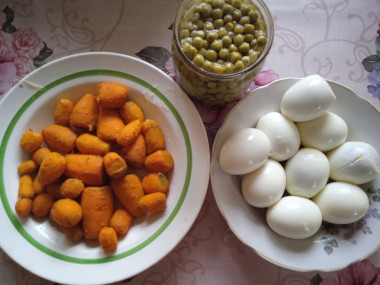 Как сделать салат с морковью, горошком и яйцом? Подготовьте все продукты, которые указаны в рецепте. Яйца вымойте, отправьте в небольшую кастрюлю или сотейник, залейте холодной водой и поставьте на плиту. На сильном огне доведите до кипения, пламя убавьте до умеренного и варите яйца около 10 минут. Далее кипяток слейте, а яйца остудите.