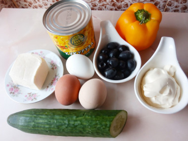 Как сделать салат с яйцом, сыром, кукурузой и огурцом? Подготовьте необходимые продукты. Кукурузу выложите на сито, чтобы освободить ее от жидкости. Оливки можно заменить на маслины. Болгарский перец можно взять желтого цвета либо двух цветов.