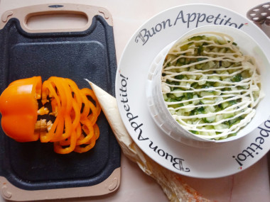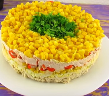 Салат можно выложить слоями в кольце (диаметром 14-16 см) либо просто перемешать все подготовленные ингредиенты в салатнике. Первым слоем выложите кукурузу, разровняйте, полейте сверху майонезом.