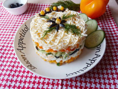 Салат с яйцом сыром кукурузой и огурцом приготовила на ДР дочери. Только слои поменяла местами. Все были в восторге от этого вкусного, праздничного салатика, спасибо вам за рецептик!