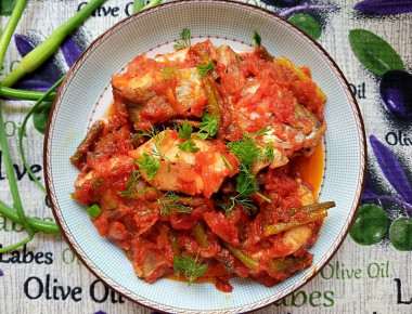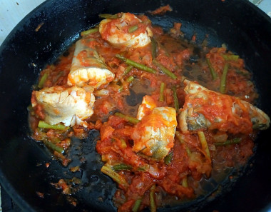 Нашла на сайте замечательный рецепт рыбы с томатной пастой луком и морковью под маринадом. Рыба у меня была в виде маленького судачка. А для маринада обжарила лук, морковь и добавила нарезанных чесночных стрелок. Потом добавила домашний кетчуп и рыбу. Тушила рыбу 15 минут, за это время три раза перевернула кусочки для равномерного приготовления. Помидоров у меня не было, но мне кажется томатного соуса было достаточно) Из специй добавила только смесь перцев из мельнички. Тушила до выпаривания жидкости. Таким образом получилось что каждый кусочек рыбы был покрыт густым томатным маринадом. Рыбка буквально насквозь пропиталась вкуснейшим соусом. Блюдо хоть и простое, но очень вкусное!
