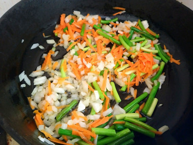 Морковку нарежьте тонкими полосками либо натрите на тёрке с крупными зубками. Лук измельчите произвольно, а чеснок пропустите через пресс или нарежьте мелко ножом.