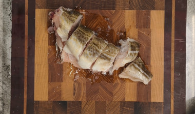 Если у вас рыба из заморозки, то выньте её заранее из морозильной камеры и разморозьте при комнатной температуре. Головы и хвосты удалите, очистите от чешуи и срежьте плавники. Если рыба не выпотрошена, то удалите так же внутренности. Ополосните рыбу под проточной холодной водой и обсушите бумажными салфетками. Нарежьте треску на произвольные кусочки среднего размера.