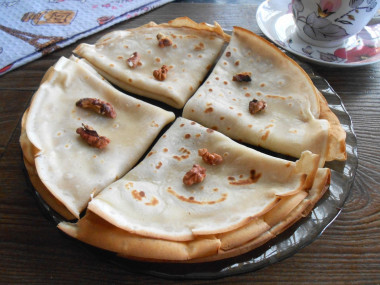 Давно не готовила блинчики) захотелось приготовить блины, а молока не оказалось. Нашла ваш рецепт "блины без молока на воде с яйцами". Все продукты есть. Решила готовить. Тесто быстро замешала и оставила, как написано в рецепте, на 15 минут, чтоб не рвались. Только не пойму как это влияет) Жарила на огне сильнее среднего. Получилось 13 блинчиков. Они очень нежные и тонкие, на моё удивление. Кушали блинчики со сгущёнкой всей семьёй. Они настолько тонкие, что в них легко можно завернуть начинку. Действительно, блинчики не рвутся! Кстати, блинчики сами по себе тоже очень вкусные) Хороший, бюджетный рецепт!