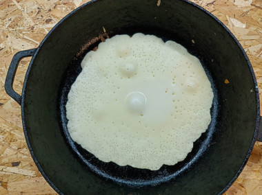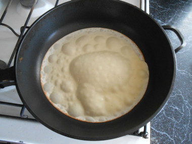 Разогрейте на сильном огне сковороду. Смажьте ее небольшим количеством растительного масла. Это нужно будет сделать только перед выпечкой первого блина, далее смазывание не понадобится — будет помогать масло в тесте. Вылейте на сковороду порцию теста. Круговыми движениями распределите его по всей сковороде.