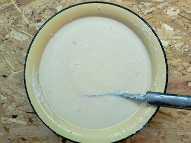 И снова венчиком хорошо перемешайте тесто. Должны исчезнуть все комочки. Если у вас была теплая вода, то проблем с этим не будет — тесто выйдет однородным. Муки может уйти и больше, смотрите по консистенции теста — оно должно стать как питьевой йогурт. Если же тесто покажется вам очень густым, то влейте еще немного воды. Готовое тесто оставьте постоять на столе минут 15 — блины при жарке не будут рваться.