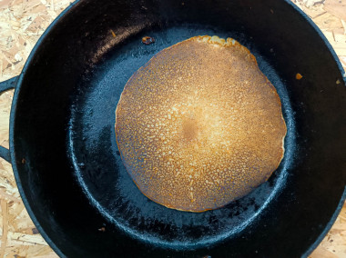 Тесто получилось достаточно жидким. Жарила блины на чугунной сковороде на среднем огне на большой конфорке. Первый блинчик у меня порвался при переворачивании. Я отрегулировала густоту теста, добавив ещё две горсти муки, после чего всё пошло как по маслу. Блинчики отлично переворачивались и не прилипали к сковороде.