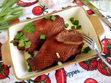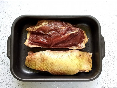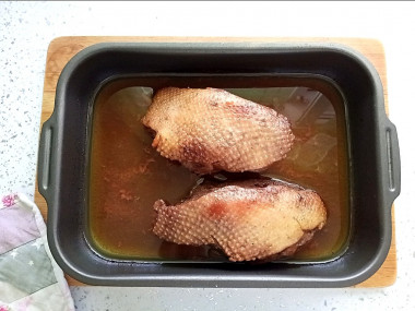 Запекла при 200°С сначала под фольгой час, потом 10 минут без фольги при 180°С. Нужно ориентироваться на вес продукта и возраст птицы, а так же работу духовки. Готовность я проверяла острым ножом. Грудки за время запекания уменьшились в объеме, а лишний жир стек в форму.