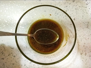 Подготовьте маринад. В глубокую небольшую ёмкость влейте растительное масло и соевый соус. Добавьте горчицу и мёд. Чеснок очистите от кожуры и пропустите через пресс- Сколько использовать чеснока? Его количество определите по собственным вкусовым предпочтениям, я взяла 4 зубка. Добавьте соль при необходимости, но помните, что соевый соус солёный сам по себе. Добавьте так же сухие специи и молотый перец. Всё перемешайте.