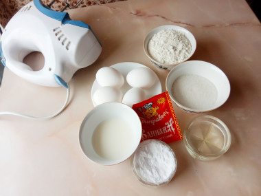 Как сделать бисквит на молоке? Подготовьте продукты. Все ингредиенты должны быть комнатной температуры, это важно для удачного бисквита. Поэтому выньте яйца и молоко из холодильника заранее. Крахмал возьмите картофельный, масло — без запаха.