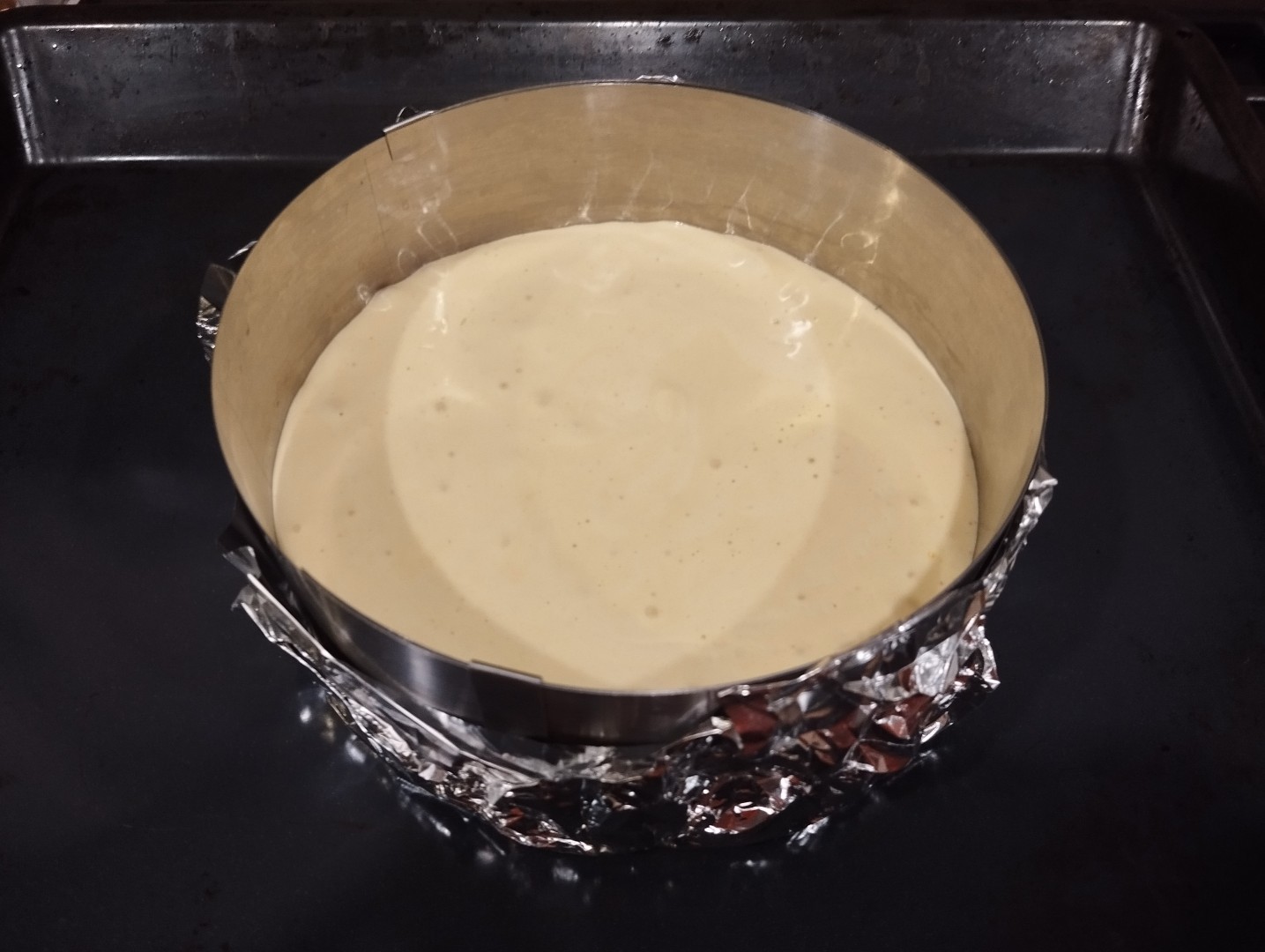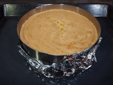Подготовьте форму для выпечки. Я пекла в кольце диаметром 18см, дно сделала из фольги. Смазывать форму не нужно. Вылейте в нее тесто. Саму форму установите на противень.