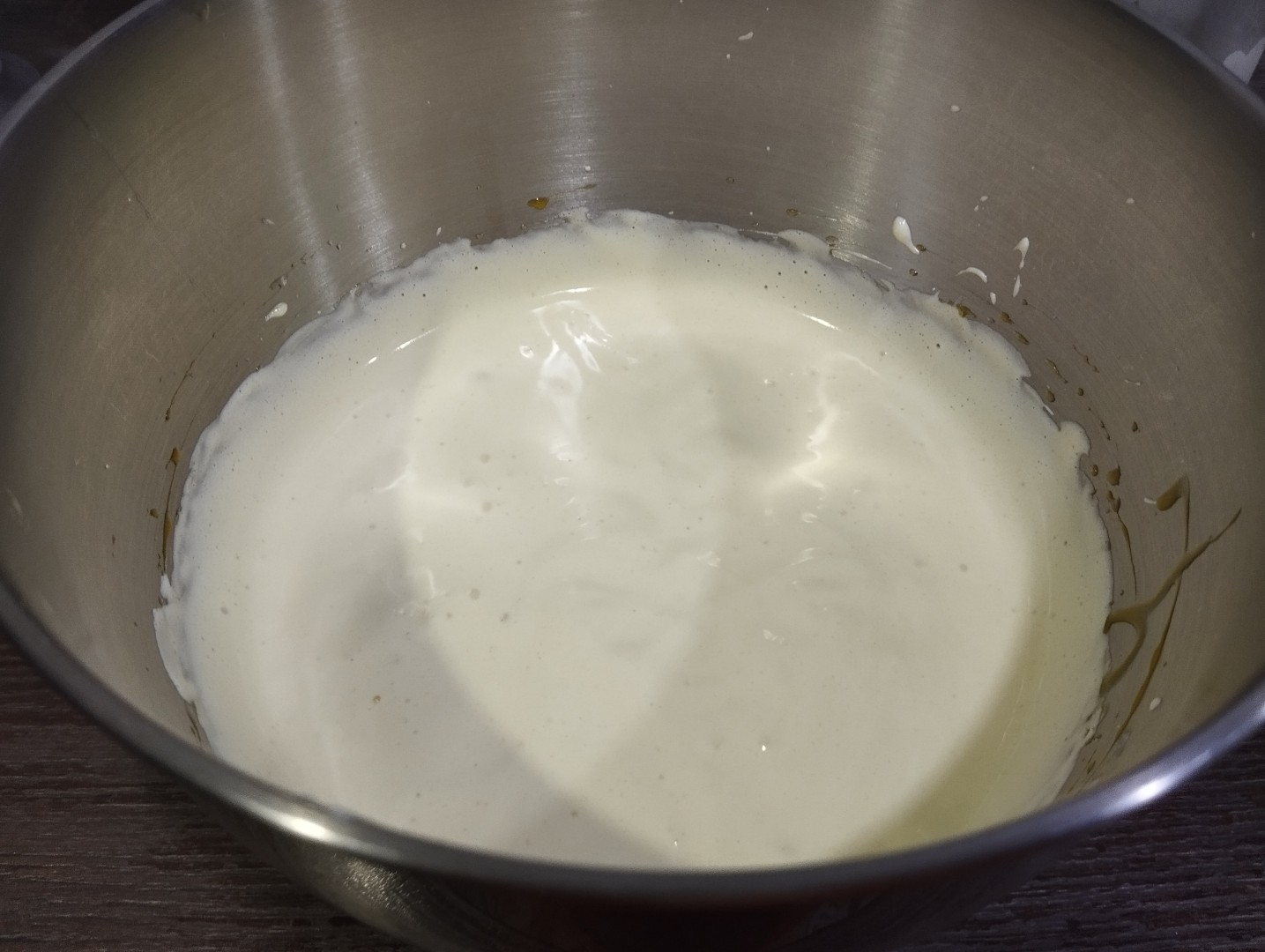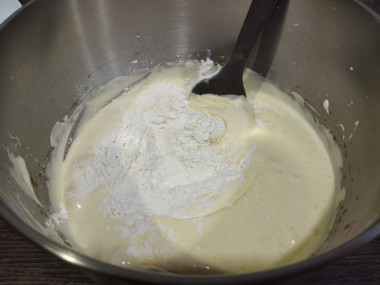 Также порциями влейте в тесто молоко с маслом. Старайтесь лить по краю миски, также аккуратно размешивая массу лопаткой. Должно получиться однородное тесто консистенции густой сметаны.