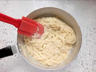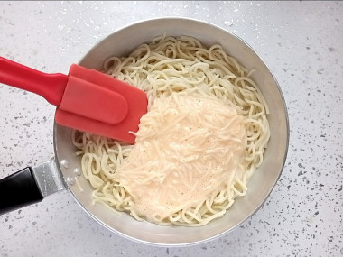 Готовые макароны переложите на сковороду. Лучше, если она будет с антипригарным покрытием, тогда сыр не прилипнет ко дну. Чтобы блюдо не получилось сухим, влейте немного воды, в котором варились макароны. Выложите в сковороду яйцо с сыром. Огонь сделайте минимальным, тогда яйцо не свернется а превратится в соус. При постоянном помешивании добейтесь полного расплавления сыра. Как только это произойдет, нагрев выключите.