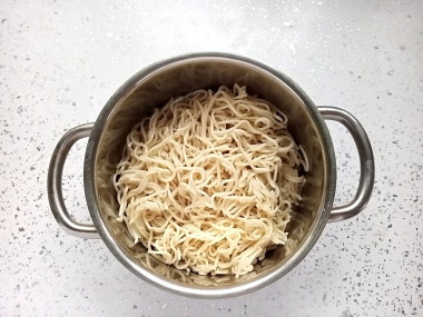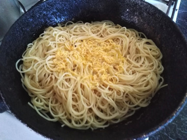 Яйцо соединила с натертым сыром и солью. Вылила эту массу на сковородку и сразу стала перемешивать, чтобы заливка полностью покрыла макароны. Я воспользовалась алюминиевой сковородой, но лучше антипригарная, ее мыть потом легче.