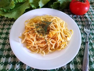 Решила сделать на гарнир к котлетам макароны, но хотелось чтоб было не банально. Нашла на любимом сайте через поиск по ингредиентам интересный рецепт приготовления макарон. Приготовила макароны с сыром и яйцом. Это очень быстро и просто. Использовала спагетти, как у автора. Яйца взяла домашние 2 штуки, а сыр выбрала гайсин, он хорошо плавится и очень вкусный. Из специй добавила соль и чёрный свежемолотый перец. Готовила чётко по рецепту. На сковороду положила отварные спагетти, добавила воды по совету автора, влила яично-сырную массу и при постоянном помешивании потомила немного на минимальном огне. Прекрасная получилась паста в соусе. Спагетти получились не сухими, аппетитными, полностью окутаны соусом из яиц и сыра. Великолепное блюдо на скорую руку! Очень вкусно получилось! Спасибо автору!